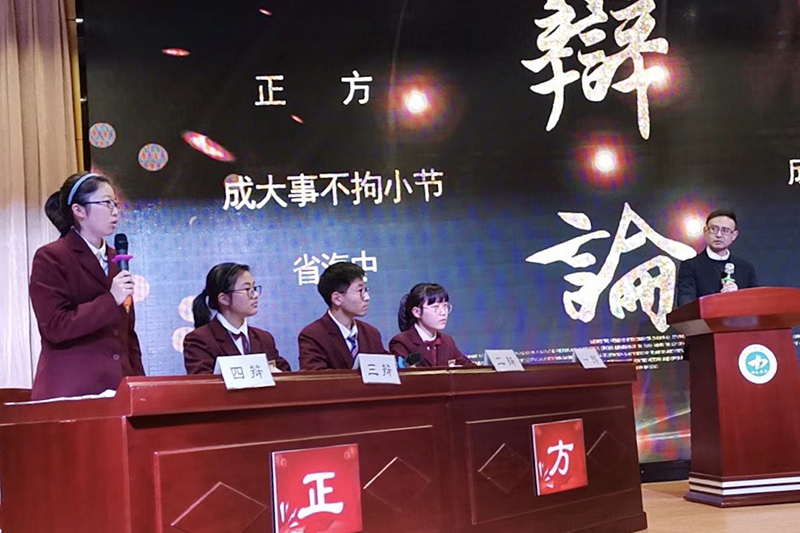 一辩江帆立论准确详实,清脆利落,端庄大方,自信果决;二辩杨铠睿擅长逻辑推理,分析丝丝入扣,妙语连珠,彬彬有礼,轻松幽默;三辩杨梓睦思维敏捷,反应迅速,引经据典,分析精准;四辩王鲍一自信从容,灵活机动,理论联系实际,视野开阔,表现卓越。海中同学博学多才,思维清晰,表达得体,表现优异,给评委会和观众留下了深刻的印象。