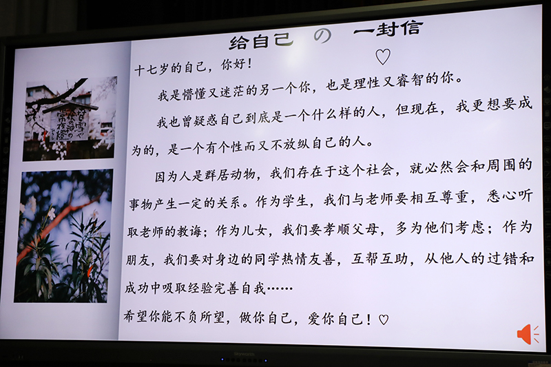 班会临近尾声,高二(15)班的同学们和主持人一起朗读了“写给自己的一封信”,同学们通过这次的班会都受益匪浅。