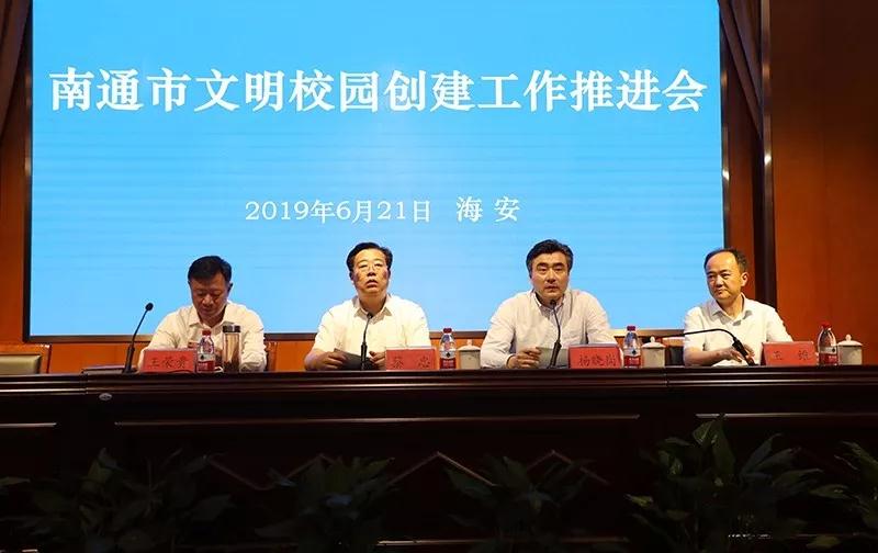 随后,在海安中学领导的陪同下,与会人员参观了海中文明校园创建成果。再移步奥林匹克楼一号会议室参加南通市文明校园创建现场推进会。南通市委教育工委副书记、市教育局党组成员杨晓岗主持了会议。海安市委常委、宣传部长王荣贵介绍了海安文明校园创建的概况。四家单位进行了经验交流。南通市委宣传部副部长、文明办主任蔡忠对文明校园创建工作进行了全面部署。