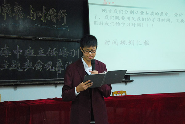 班会观摩课是由高一9班举行,主题为“终日乾乾,与时偕行”。主要针对刚刚迈入高中生活的高一新生时间意识不强、浪费时间等比较突出的问题进行设计,一共包括五个环节:惜时小实验、视频赏析、时间规划方案展示、挤时间心得分享、惜时歌曲联唱。环环相扣,步步深入,具有较强的感染力,达到预期目标。