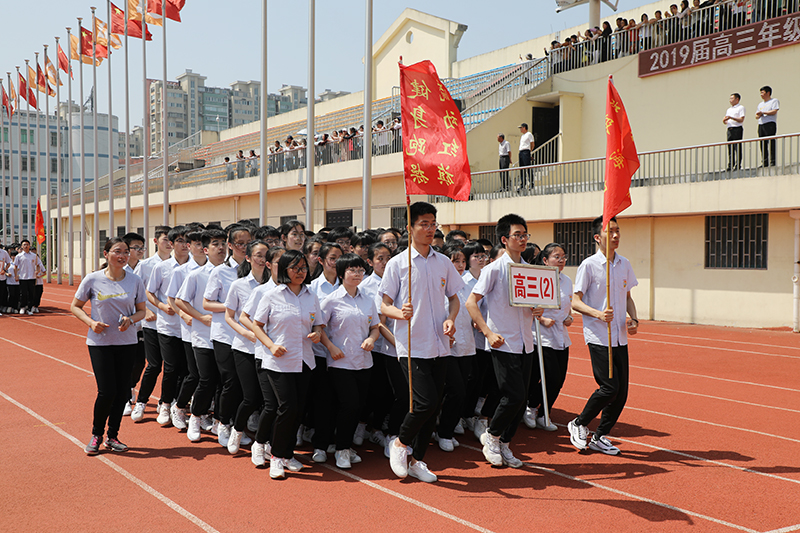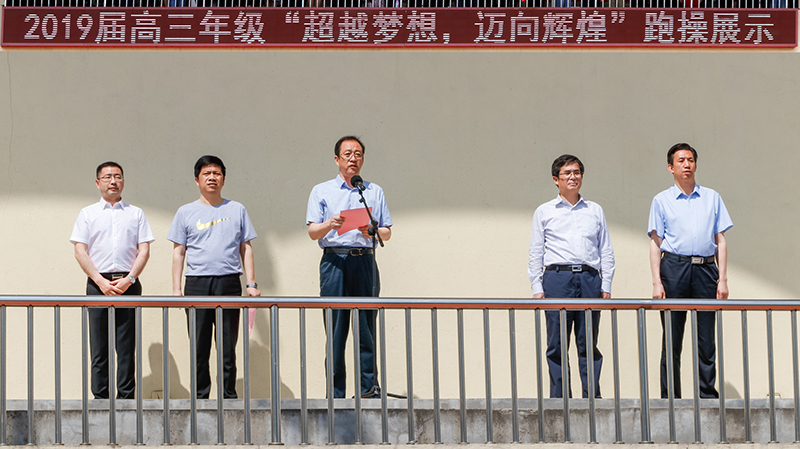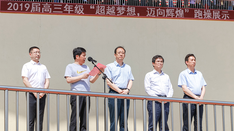 学校党委书记、校长吕建作了热情洋溢、语重心长、鼓舞人心的讲话。吕校长肯定了高三学生在海中三年的跑操让全体同学收获了健康,收获了快乐,也收获了人生坦途与灿烂的未来。吕校长引用习近平总书记的话:“幸福是奋斗出来的!”“我将无我,不负人民。”他勉励全体高三学生:我将无我,不负青春韶华!希望同学们在高考面前,要相信学校,相信老师,更要相信自己的实力,充满信心,决胜高考。吕校长提议同学们以热烈的掌声向老师们的奉献精神表示衷心感谢!他希望全体高三同学全力以赴,自信拼搏,成功必将如期而至。希望就在不远处等着我们。吕校长还希望同学们要明白高考成功固然精彩,但精彩的人生之路还有千万条,高考并不是唯一的通道。面对考试的结果,要胸怀平常之心,海中的学子此时更应该有一份坦然和豁达。吕校长也希望高一、高二的同学们要向高三的学长们那样,只争朝夕,百炼成钢,扎实奠基,厚积薄发,用汗水去书写自己无悔的青春!最后,吕校长代表全校师生衷心祝愿,祝2019届全体高三学子金榜题名!圆梦高考!祝愿2019年高考海中再创奇迹!永葆辉煌!