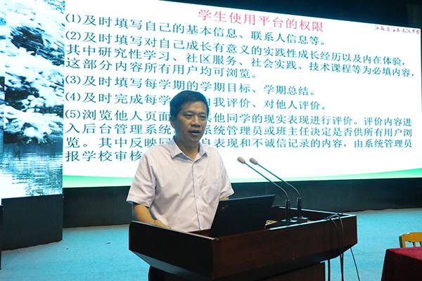 董校长首先对综合素质评价进行了操作层面的指导。在此部分讲座中董校长首先介绍了综合素质评价的相关背景以及我校综合素质评价平台的特点和内容,接着阐释了我校综合素质评价电子平台命名为“学生成长记录”的内涵以及平台发展的前世今生,然后就如何登录平台,改写相关信息,学生、家长、老师和班主任的登录权限,从哪些维度填写评价表,某一维度填写哪些具体内容等方面进行了细致周密地操作层面的指导,并指导学生、家长和教师如何借力平台去发现真问题,解决真问题,真解决问题,从而真正有效地促进学生综合素质的全面发展。