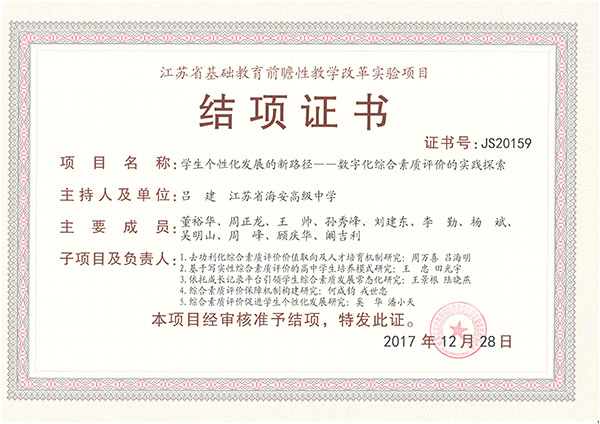 江苏省首批基础教育前瞻性教学改革实验项目结项证书
