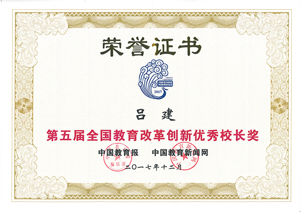 第五届全国教育改革创新典型案例推选活动优秀校长奖证书