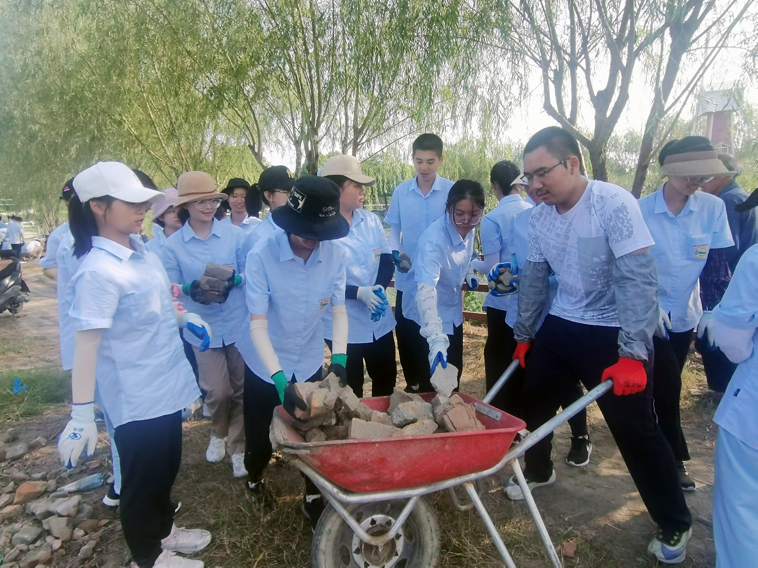 “搬砖块还不简单,我力气大得很,肯定搬得比你多。”一同学抬起装着砖块的小推车风风火火走过。