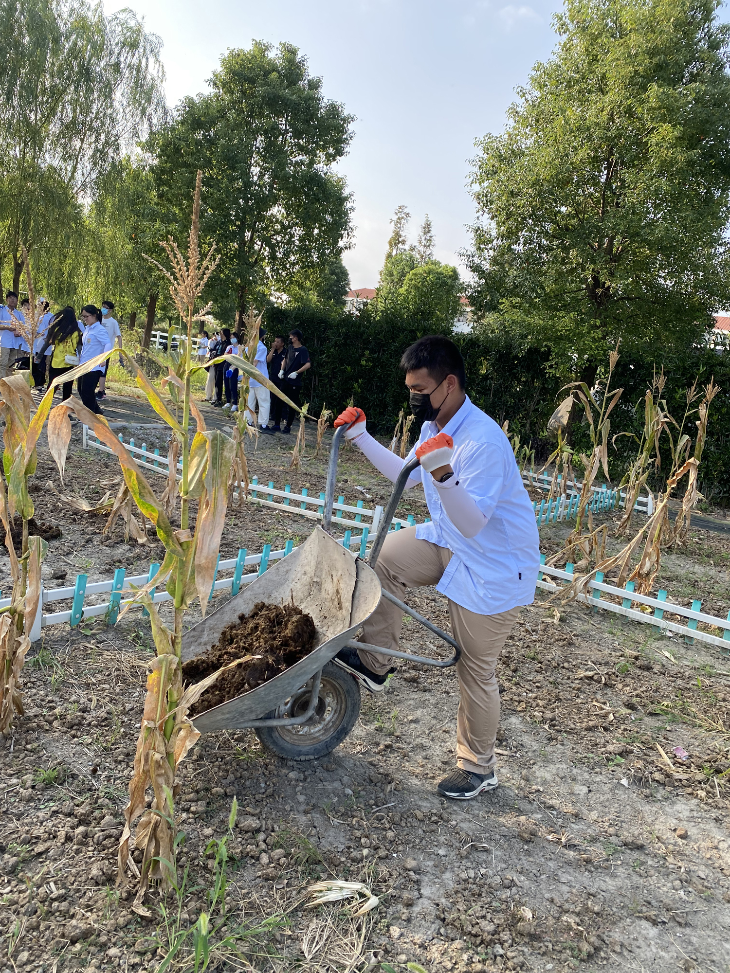 宽阔的草坪上,同学们合力推着锄草机缓缓走过。其他学生三三两两行走于其上,一弯一起之间,锄草机未能剪去的杂草被逐根拔除。
