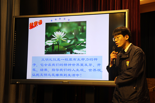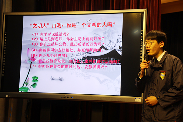 12月17日晚,高一7班在博雅小剧场举办了“文明伴我行”主题班会。出席班会的有钱俊元副校长、女工委史慧敏主任,高一二年级各班学生干部代表以及家长代表。