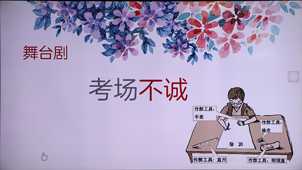 本次主题班会主要围绕三个核心问题展开,即“诚信是什么”“身边的不诚信与诚信”“为什么要诚信”。首先,同学们通过一则公益广告引入正题,开门见山,并让同学围绕“诚信是什么?”以及“你能做到诚信吗?”进行讨论。接着几位同学用舞台剧的形式演绎了皇甫绩守信求责的故事,通过这种方式让同学们体会到了中国作为礼仪之邦,诚信在古人身上闪耀的光辉。紧接着,在主持人与同学们对于身边的不诚信与诚信现象进行积极互动之后,自然的插入“考场不诚”的情景剧,进一步对身边不诚信的现象进行辩证批判的思考,同时也折射出学习生活中诚信的重要性并顺利引出下一个问题“为什么要诚信?”,让同学们深入思考诚信的内在意义和核心价值。最后,在一段“诚信”原创朗诵中,本次班会圆满结束。