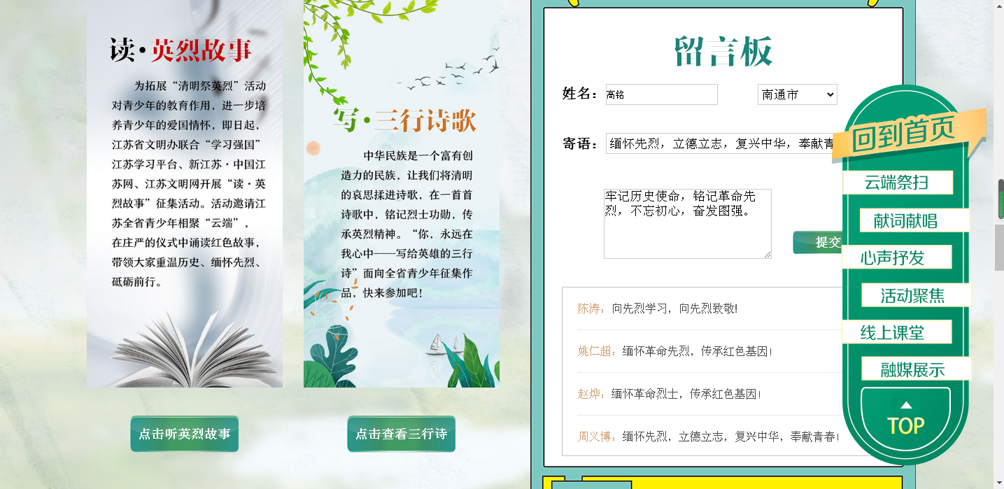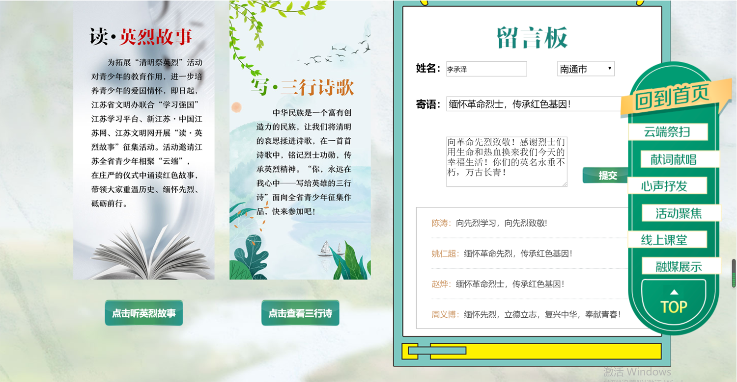 当下,疫情防控形势严峻,但灰色的阴霾阻挡不了我们对革命先烈诚挚的思念。清明前夕,我校德育处、团委向全校师生发出倡议,通过线上祭扫、云端追思的方式,缅怀革命先烈,致敬民族英雄。师生们积极响应,纷纷登录祭扫专题网页,以向烈士献花、发表留言寄语、录制视频等多种形式传递自己的思念与敬仰。网页上一句句发自心灵深处的留言,一支支点燃的烛火与放飞的白鸽将深切的缅怀捎至云端。