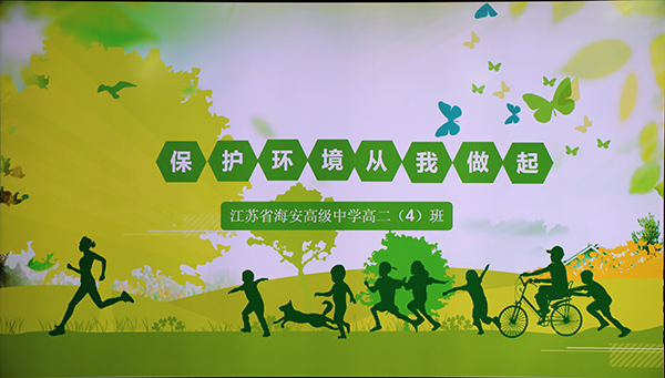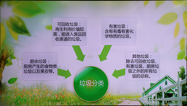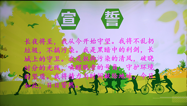 首先,主持人为大家播放美景图片和环境污染视频,同学们从大好河山的赞叹声到环境污染的叹息中,在美与丑的对比中,萌生保护环境的意识、焕发保护环境的激情。接着,几位同学为大家带来小品《害人害己》,通过精彩的表演展现了一些破坏环境的行为,同时让大家懂得地球是我们大家的,保护环境人人有责。在如何用实际行动来保护我们的家园这一环节中,通过观看采访视频、现场问答和垃圾分类知识有奖竞答活动充分调动了同学们的参与热情,掌握了垃圾分类知识。然后,主持人组织了一场模拟听证会,来自各方的代表各抒己见,提出了很好的保护环境的意见和方法。最后主持人与大家一起宣誓,坚定大家了保护环境的决心!