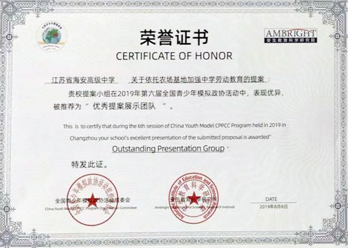 劳动教育结硕果 来源: 发布时间:2019-08-08 00:00:00 浏览次数: 次 【字体:小 大】 2019年8月8日,我校学子参加全国青少年模拟政协活动,提案《关于依托农场基地加强中学生劳动教育》,被确定为“优秀展示团队”。 分享到: 【打印正文】