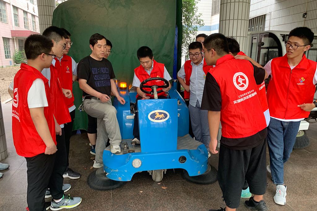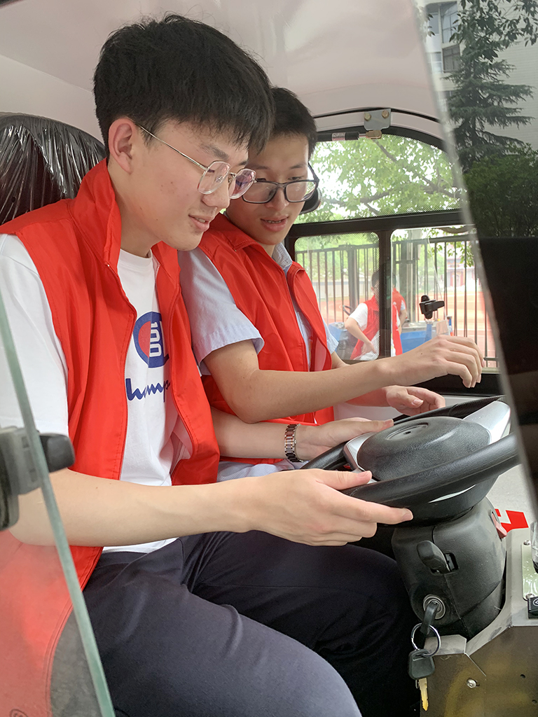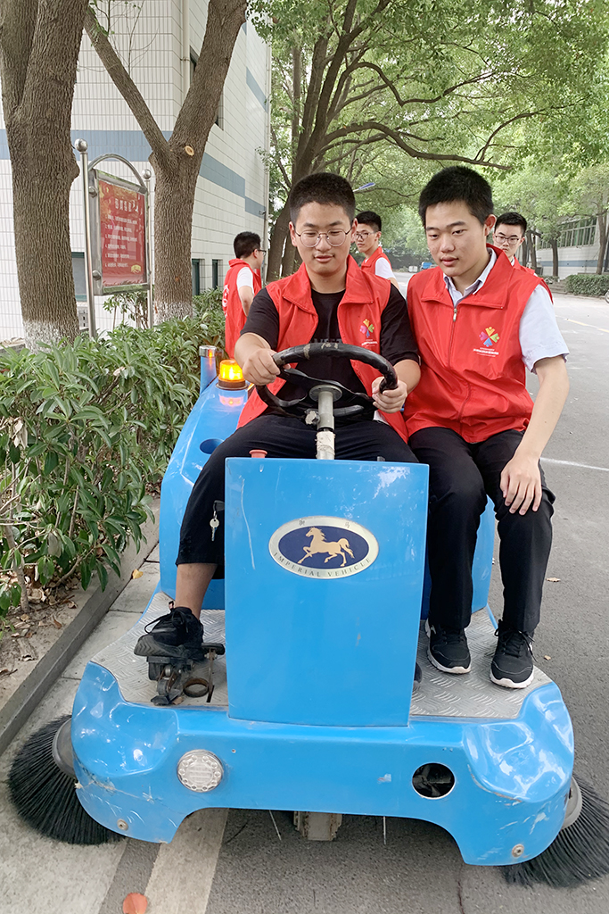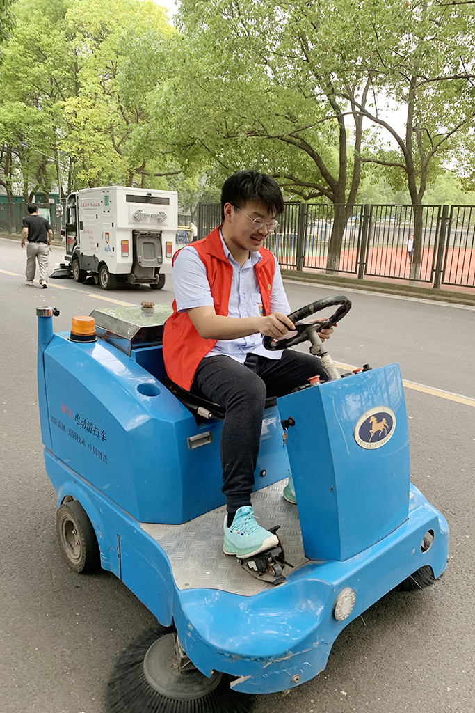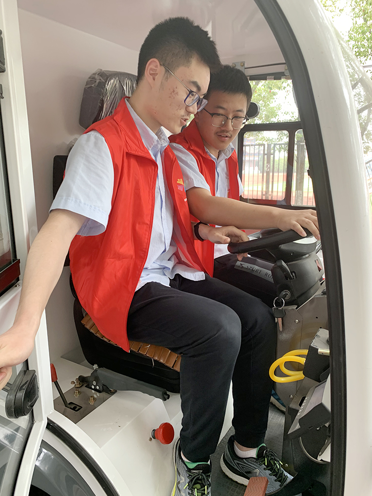 6月12日,省海中部分志愿者来到成才大道体验电动扫地车。在德育处张士均老师的指导下,志愿者们摩拳擦掌,跃跃欲试,争先恐后地登上电动扫地车,为校园的美化贡献力量。