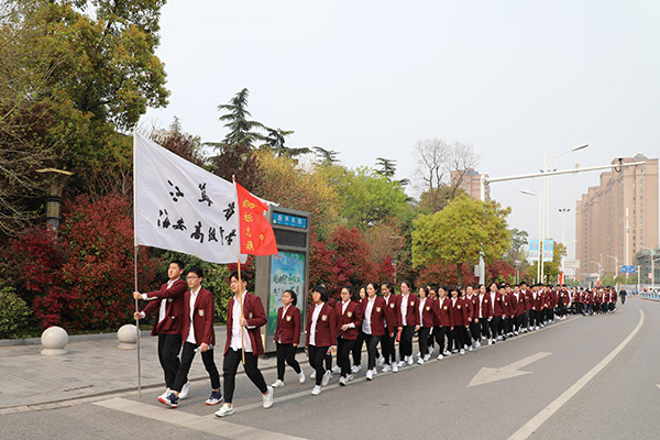 伴着晚霞,怀着激动的心情,同学迈着坚实的步伐,整齐有序地返回校园。