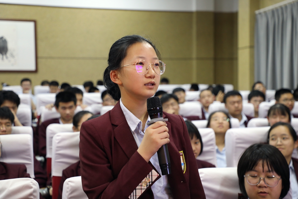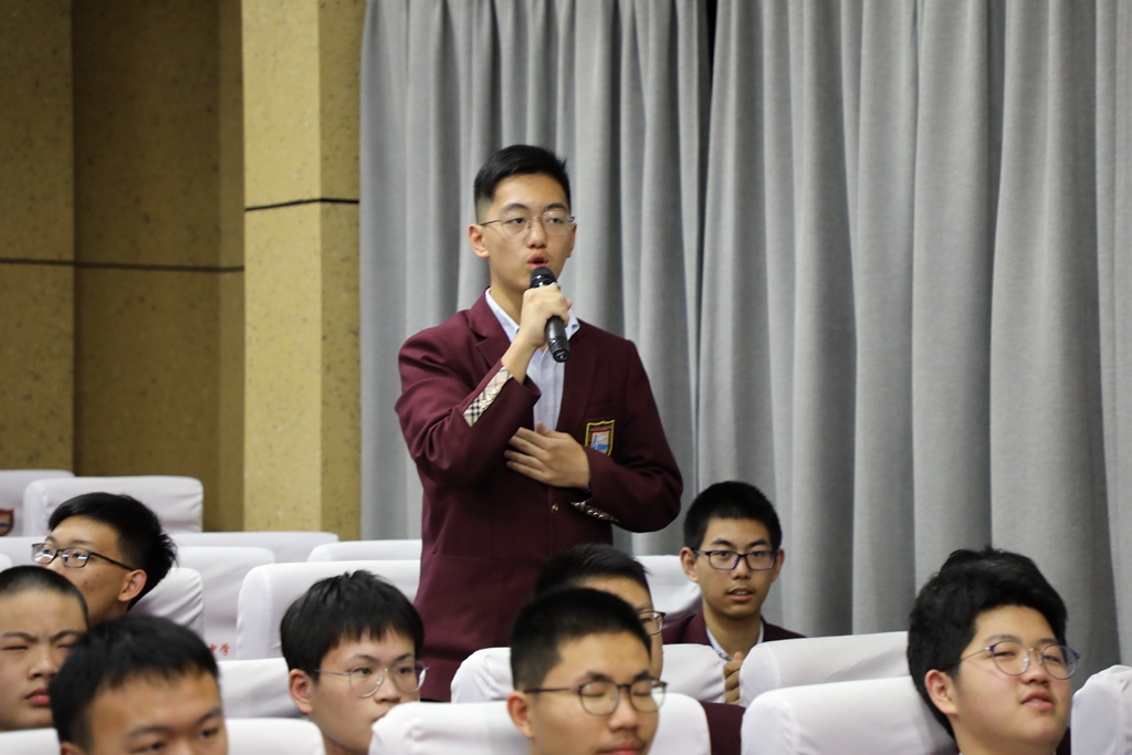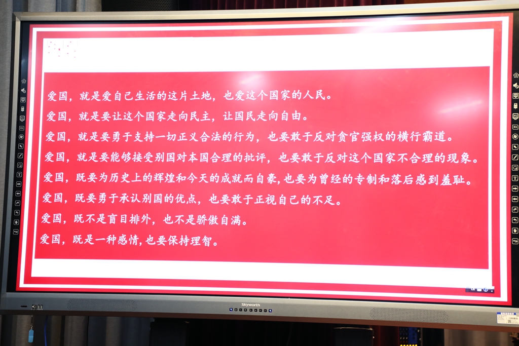 紧接着,缪宜静,徐婉,蒋承翰,三位同学分别给我们带来了解放军飞行员王伟、中华人民共和国代表梁帆、抗疫英雄彭银华三位当代英雄的爱国事迹。一个个惊天动地的英雄故事打动了每一位同学。随后,我们一同聆听了习近平总书记的教诲,对于“新一代青年,我们应该如何爱国”大家积极分享了自己的看法。许佳同学,卢俊佑同学提出:爱国不是盲目排外,要保持理智。陈师帅、孙若予两位同学带来相声《祖国在我心中》,以幽默风趣的语言为我们呈现了光喊口号不行动的现象,张梓洋同学对此表达了自己的看法。