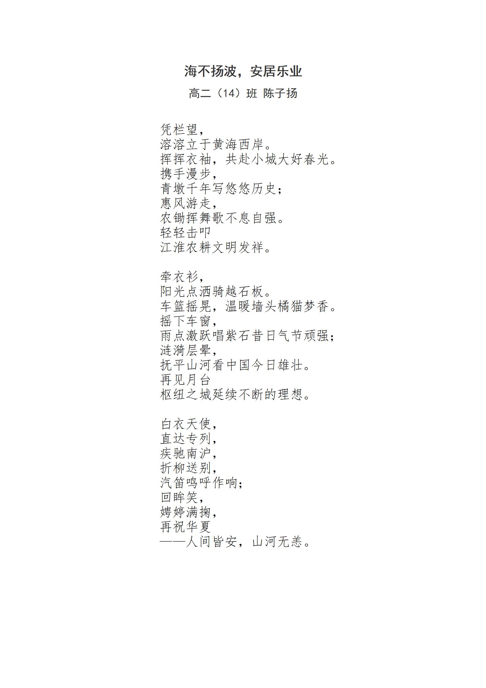 4月下旬开始,海安中学以“诗歌寄情 筑梦未来”为主题发起“青春心向党”原创诗歌征稿活动。围绕奋斗新时代、奋进新征程,鼓励同学们用诗歌形式抒发爱党、爱国、爱家乡、爱社会主义的真挚情感,展望全面建设社会主义现代化强国的光明前景,展现新时代青少年立志为实现中华民族伟大复兴的中国梦而努力学习、成长成才的精神风貌。