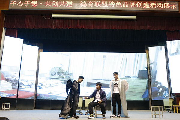 中午,各联盟学校的带队领导和学生演员陆续抵达海中体艺馆。换装,化妆,走台……同学们有条不紊,紧张有序,为下午的“春满校园�情系青春”心理健康教育主题活动做最后的准备。3:40,活动准时拉开帷幕。南通市教育科学研究院心理学科教研员符小斌老师、海安县教育局中教科谢玉平科长、各联盟学校德育领导、我校吕建校长、杨斌、董裕华副校长、工会吴明山主席、高一年级全体师生和部分家长代表出席此次活动。首先,副校长董裕华代表学校做了精彩致辞,他强调了心理健康教育的重要意义,介绍了学校近些年在心理健康教育方面的实践和成绩。然后,海安中学、曲塘中学、实验中学、李堡中学的同学们依次登台,为大家表演了四部校园心理剧。同学们的表演精彩纷呈,触动人心,现场观众掌声不断。