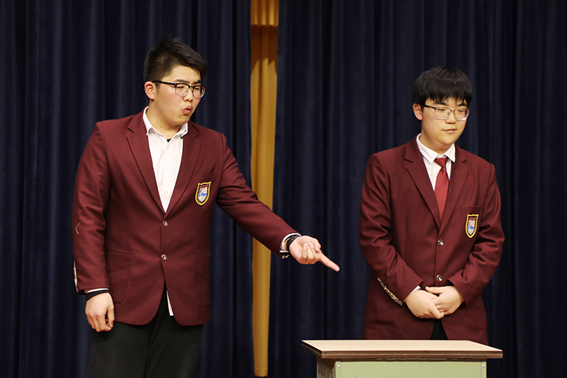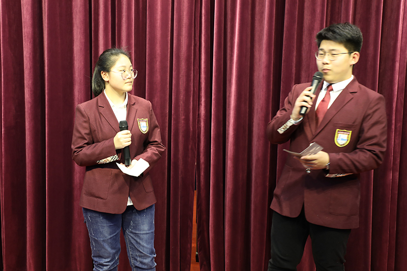 主持人徐斯璟、李玖峰以一段简单、幽默的对话引出本次班会的主题。随后唐赟、张徐瑞表演了一段相声,以一个高中生在国内外景点种种不文明行为为切口,引发了同学们对游览之礼的讨论与思考。在主持人的带领下,同学们复述了“八礼”的具体内容。