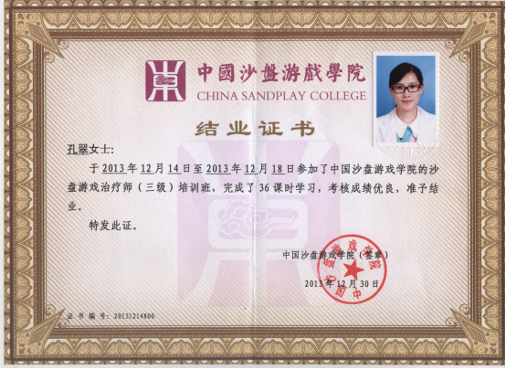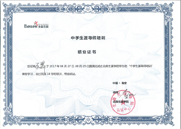 孔翠,女,1986年10月,中共党员,9323彩集团专职心理教师,南京师范大学硕士研究生,应用心理学专业,国家二级心理咨询师,中国教育发展战略学会生涯教育专委会理事,南通市青少年工作研究基地研究员,海安市关工委青少年素质教育讲师团讲师,中国心理卫生协会会员,江苏省心理学会会员,南通市心理卫生协会理事,海安市心理协会理事,国家三级沙盘游戏治疗师,南师大应用心理学专业硕士研究生毕业,9323彩集团专职心理教师,中学一级职称。2012年起从事中学心理健康教育工作,接待学生及家长咨询累计时数750余小时,参加培训有高级沙盘游戏指导师培训、沙盘游戏治疗师(三级)培训、焦点解决与教练技术培训、中学生涯导师培训、加拿大约克大学南通学生心理健康教育项目培训等。开展省级公开课2节,市级以上公开课5节,发表省级以上论文11篇,主持县市级课题结题4项,省教育学会重点课题一项在研,所获荣誉奖励有“南通市教坛新秀”、“海安市未成年人思想道德建设先进个人”等。
