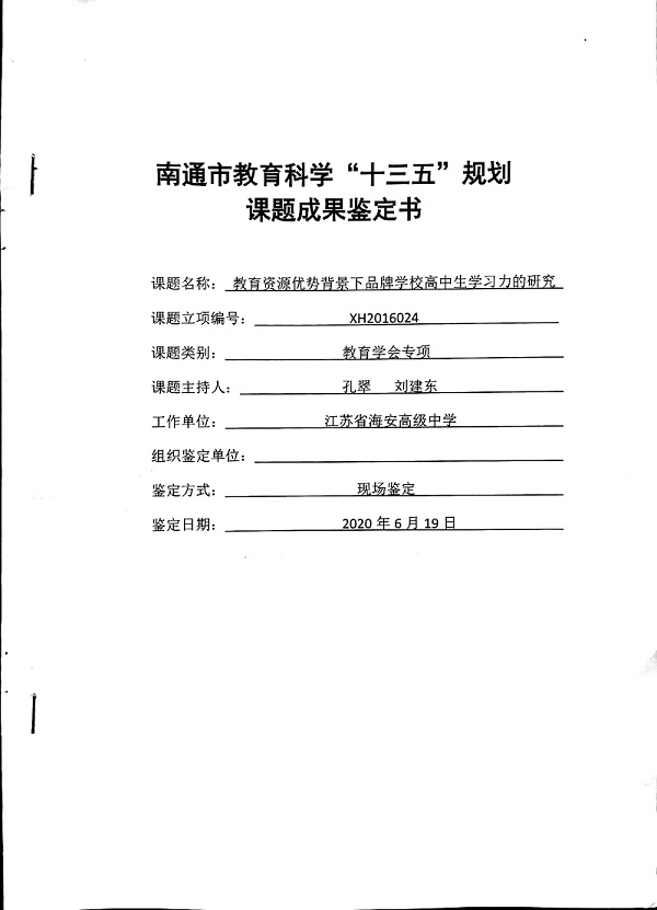 我校心理中心申报“十三五”南通市教育科学规划课题顺利结题