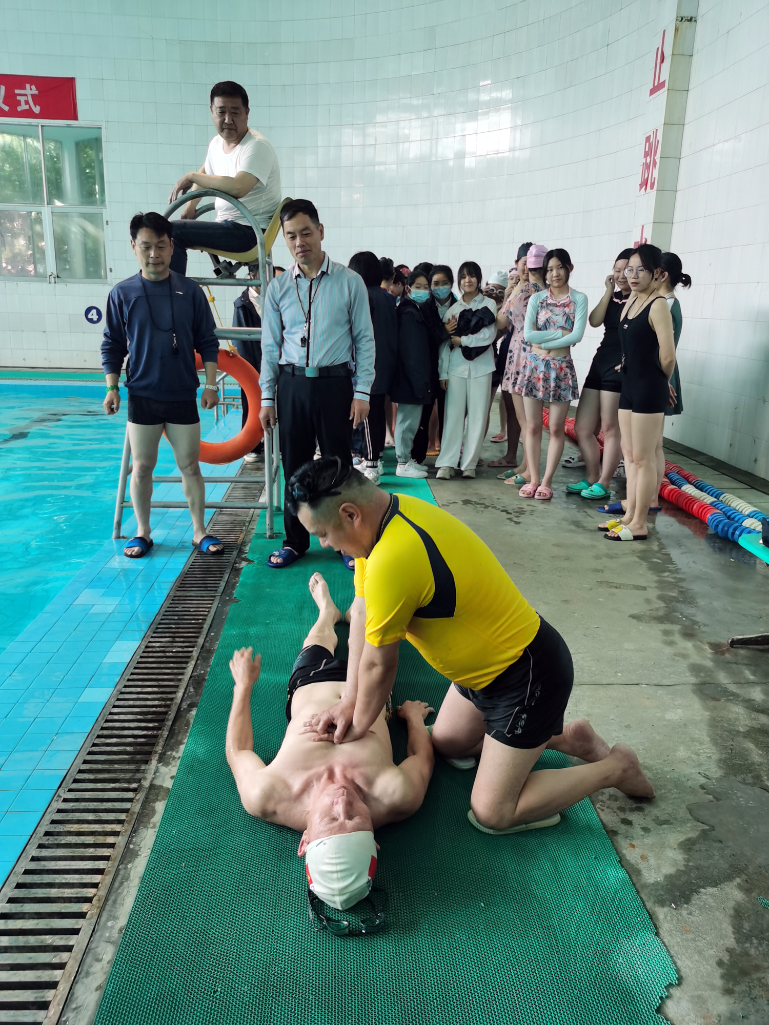 学校游泳馆救生员老师从专业角度详细讲解了救生用具的正确使用方法,并讲授了抽筋、呛水等意外发生时的相关救生知识。随后,救生员老师组织学生认真学习了泳池观察和防护、水下缠抱救助、运送溺水者及心肺复苏等技能,并进行了实战演练。