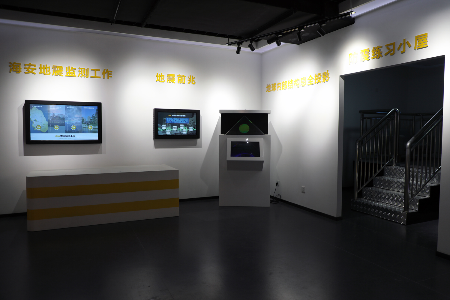 地震科普展示区主要设立了板块漂移模块、地震演示沙盘模块、地震前兆模块、海安地震监测工作模块以及海安重要建筑抗震设防及应急避难场所。板块漂移模块,讲述地球板块和世界地震带的分布及概况;地震演示沙盘模块介绍了地震、火山、海啸的相关知识;地震前兆模块主要包括地震前兆现象、监测工作仪器、工作原理、地震速报工作及意义;海安地震监测工作模块主要展示全省地震台站、海安地震台站及地震监测项目;海安重要建筑抗震设防及应急避难场所主要包括应急避难场所的查询功能和居家防震准备及对策的介绍。