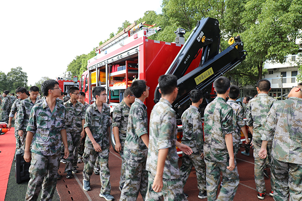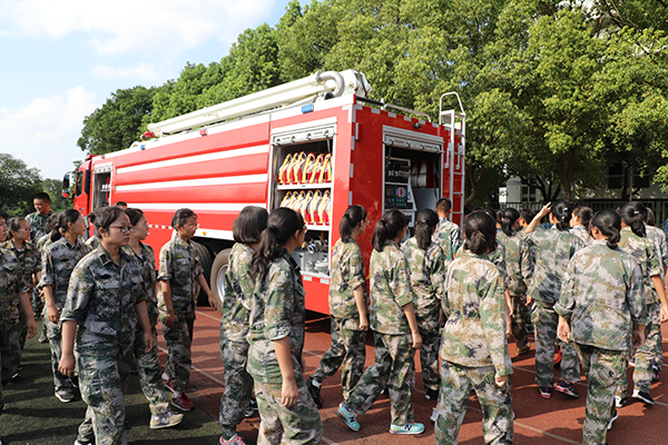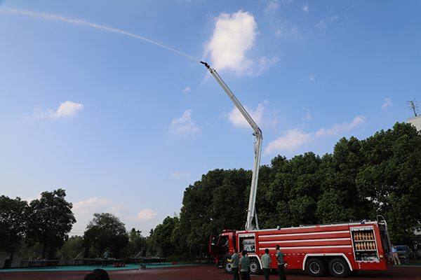 在参观消防抢险设备的同时,海安市黄河路消防中队的官兵们还向高一学生进行了高喷水车的救援展示,同学们也积极参加了灭火操作演练和模拟演练活动。