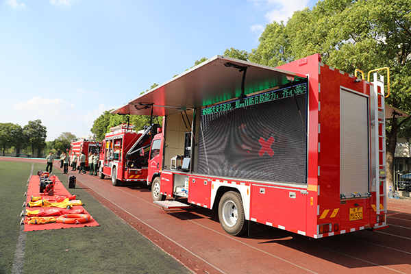 讲座结束后,同学们来到了操场。海安市黄河路消防中队的官兵们向同学们展示了抢险救援车、高喷消防车、消防宣传车以及其他一些消防抢险的设备,在同学们参观的过程中消防官兵们耐心地讲解各种设备的用途。