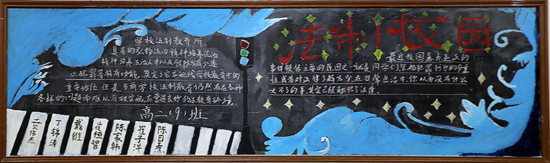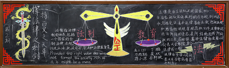 我校为了加强和推进对学生的法制宣传教育,增强法制观念,加强学生学法、尊法、守法、用法意识,学校高二年级近期举行了以法制教育为主题的黑板报评比活动。