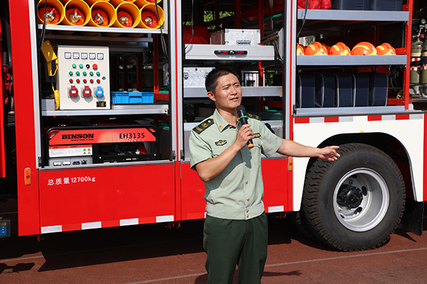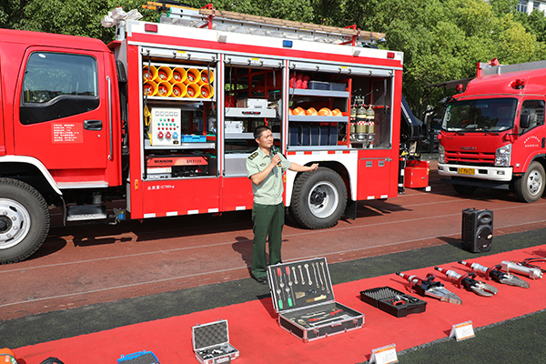 讲座结束后,同学们来到了操场。海安市黄河路消防中队的官兵们向同学们展示了抢险救援车、高喷消防车、消防宣传车以及其他一些消防抢险的设备,在同学们参观的过程中消防官兵们耐心地讲解各种设备的用途。