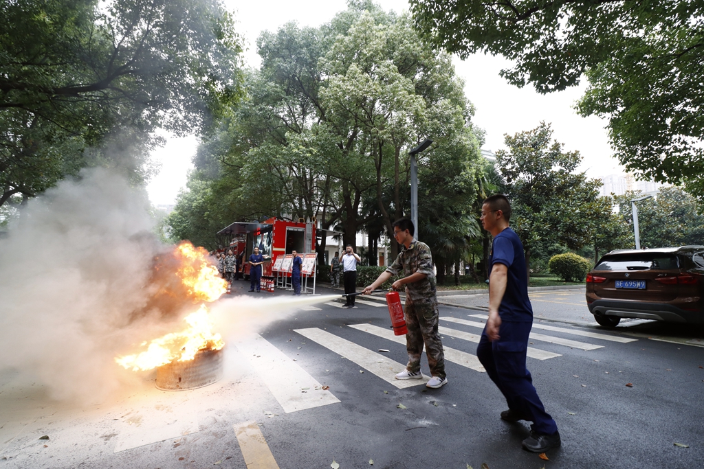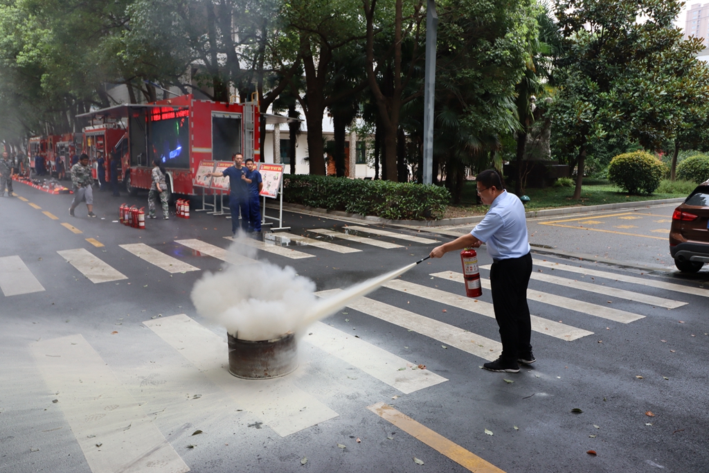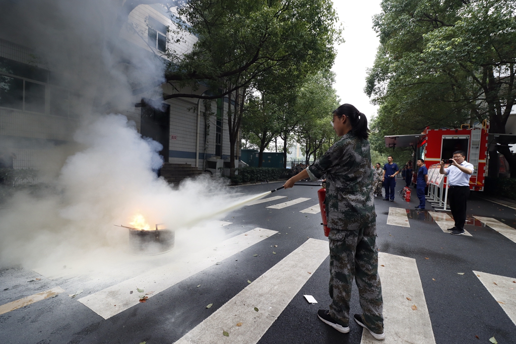 讲座结束后,进行了干粉灭火器操作现场演练。消防官兵详细介绍了灭火器的使用步骤,并为大家演示了其使用方法和注意事项。部分学生代表在教官的指导下,进行了灭火实际操作。