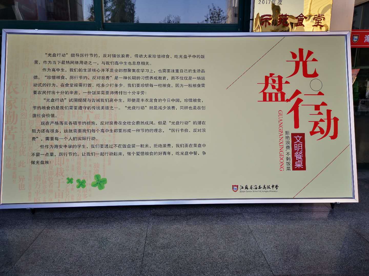 “惜衣有衣,惜食有食”。每一个人的小节约就能形成全社会的大节约,全校师生在工作和生活中要养成处处节约的良好习惯。日常就餐时,按需点餐,遵守餐桌礼仪,爱护用餐环境,以光盘为荣。从珍惜一粒米、一滴水、一度电、一张纸等小事做起,以实际行动杜绝铺张浪费,让勤俭节约在海安中学蔚然成风。