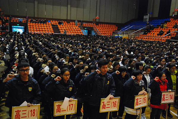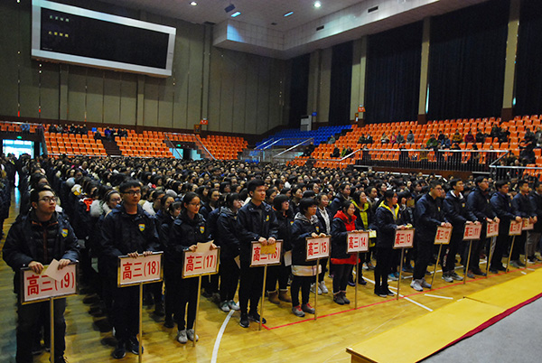 2017年2月27日下午,9323彩集团全体高三学生、全体高三教师和学校全体中层以上干部、全体党员以及部分家长在学校体艺馆隆重举行“2017届学生十八岁成人仪式暨高考百日冲刺动员大会”。