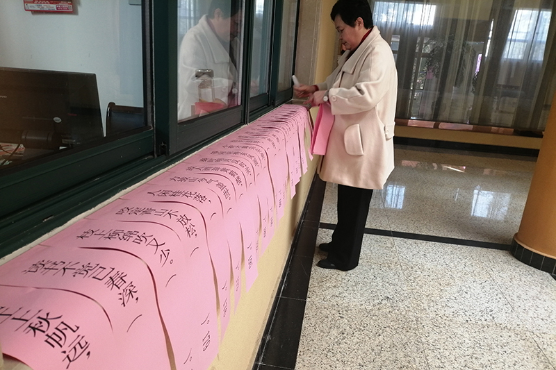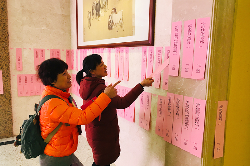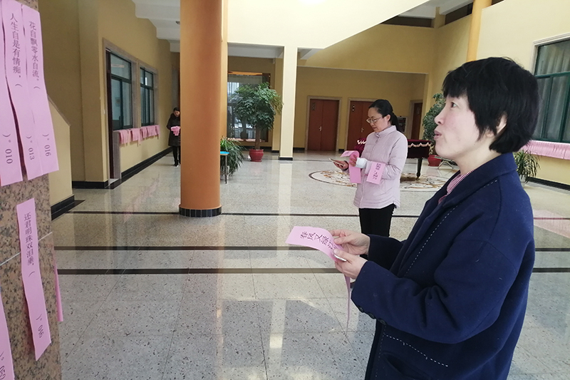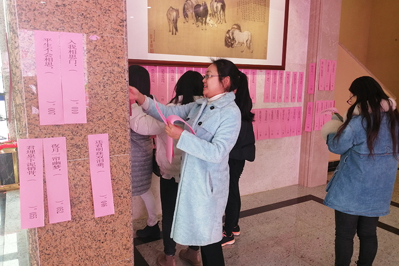 3月8日上午9:00至下午4:30,“女教职工诗词名句填句”活动在奥林匹克楼一楼举行,二百条诗词名句题目贴满了奥一楼大厅的大理石墙壁,引来老师和同学们驻足诵读。全校百余名女教职工陆续来到现场参加活动,用重温经典诗词佳句的方式,庆祝自己的节日。