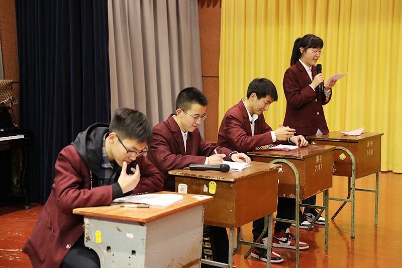 开场白过后,陆宇、谭子和徐秦宇同学为大家表演了一段有关石板街拆迁的短剧,引出班会主题。主持人江帆、杨铠睿同学引导大家围绕主题展开互动。大家积极参与,蒋骏阳、顾畅和范奕涵同学分享了他们的儿时海安记忆。生物老师陆德平也光临现场,讲述舌尖上的海安,派发海安传统小吃,气氛愈加活跃。全场气氛的最高潮是有奖竞猜“海安话十级测试”。最终,高一5班的周宇书同学荣获“十级证书”。