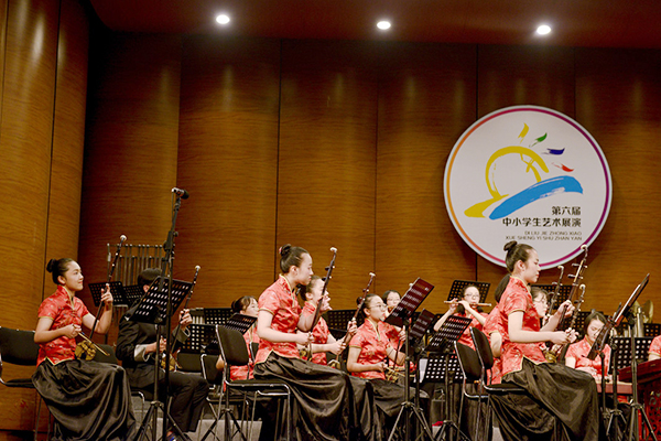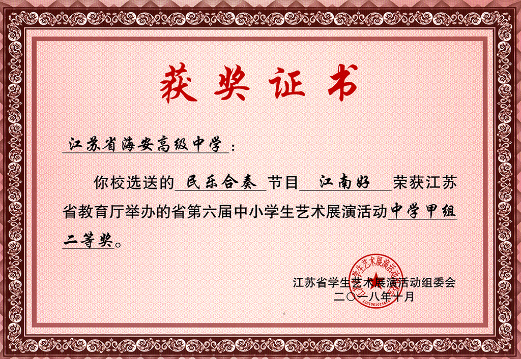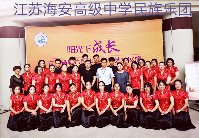 2018年8月26日下午,海安高级中学民乐团经过层层选拔,以南通市器乐类第一名的成绩代表南通参加江苏省教育厅主办的“阳光下成长——江苏省第六届中小学生艺术展演活动”。展演活动在南京紫金大剧院举行,本次比赛,分小合奏、民乐合奏、管弦乐合奏等几个组别进行,海中民乐团以一曲优美的《江南好》获得了专家评委们的一致好评,取得民乐合奏类全省第三名的好成绩。