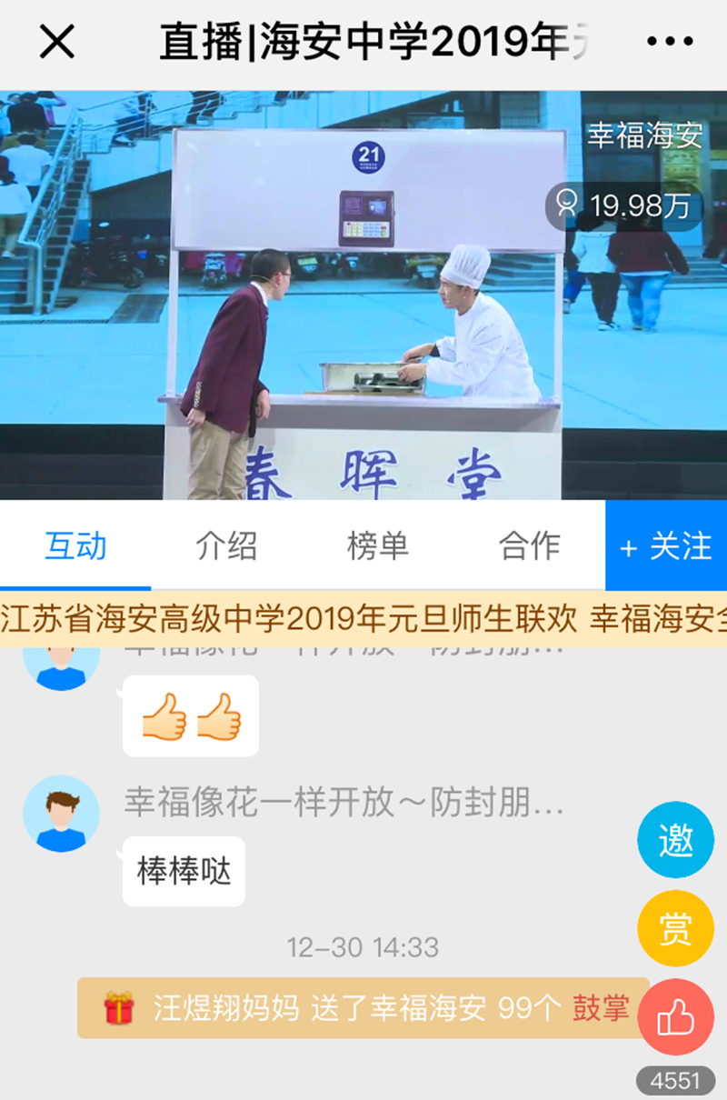 海中校园不仅有浓郁的书香,而且有高雅的品味;海中校园不仅是成长的摇篮,而且是艺术的殿堂。这次联欢会是我校素质教育成果的又一次集中展示,“直播海安”和“幸福海安”直播平台都对此次活动进行了网络直播,点击量近40万人次,引起了良好的社会效应。