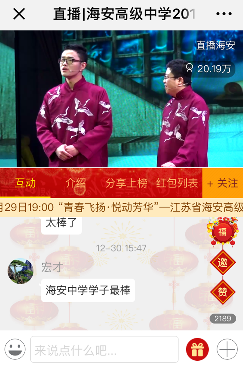12月29日,海安高级中学举行了2019年“青春飞扬 悦动芳华”元旦师生文艺联欢。联欢会分下午、晚上两个专场,29日下午和晚上海中体艺馆内喜气洋洋,热闹非凡,全校师生欢聚一堂,高一、高二的同学们轮流享受了一场饕餮文艺盛宴。海安市委常委宣传部长严长江,海安市政府副市长彭晓红,海安市文广新局党组书记、局长华志刚,海安市教育工委书记、局长汪宁,海安市教育局副局长颜敏,以及全市各兄弟学校的领导、老师及家长朋友莅临了演出现场,与海中师生分享跨年的欢乐。