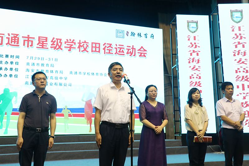 海安市教育体育局局长章晓丽在开幕式仪式上致欢迎词;南通市教育局体卫艺处处长张翊翔致开幕词,海安中学田径队史鸿杰同学代表运动员宣誓,本次大会的赛事主管助理国家级裁判徐清泉老师代表裁判员宣誓。南通市教育局副局长杨立荣先生宣布运动会开幕。