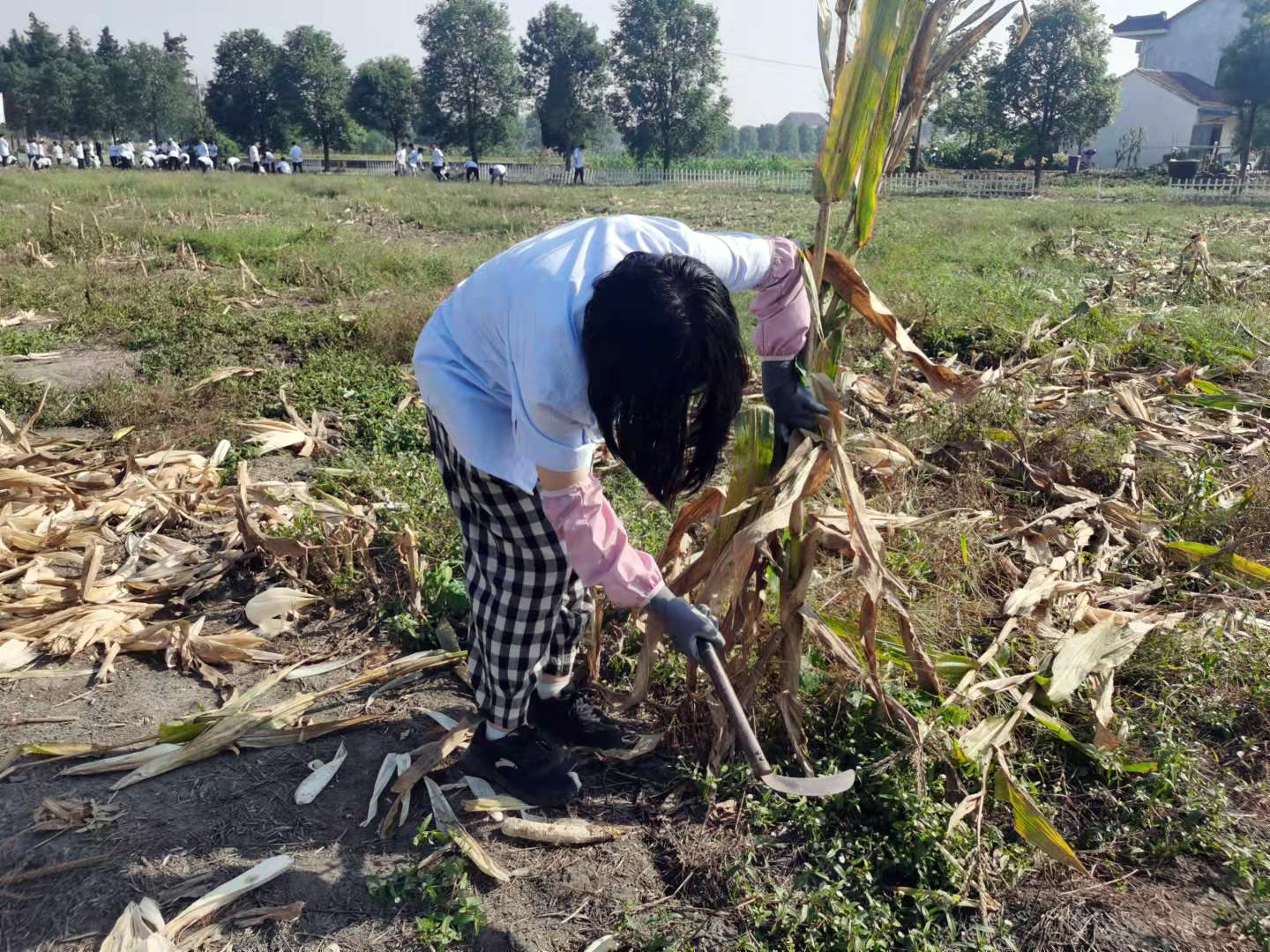我用镰刀收割玉米秸秆还行吧