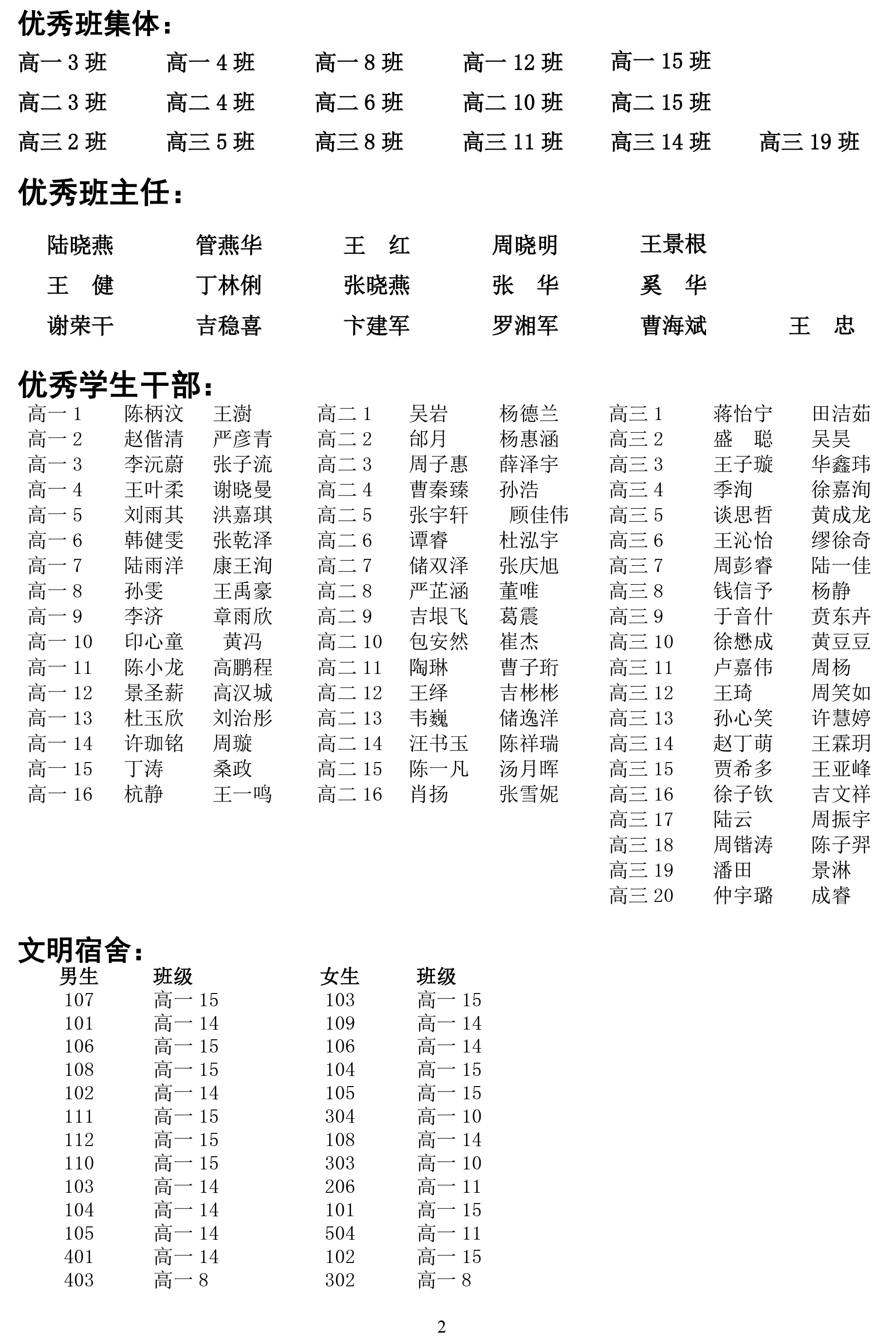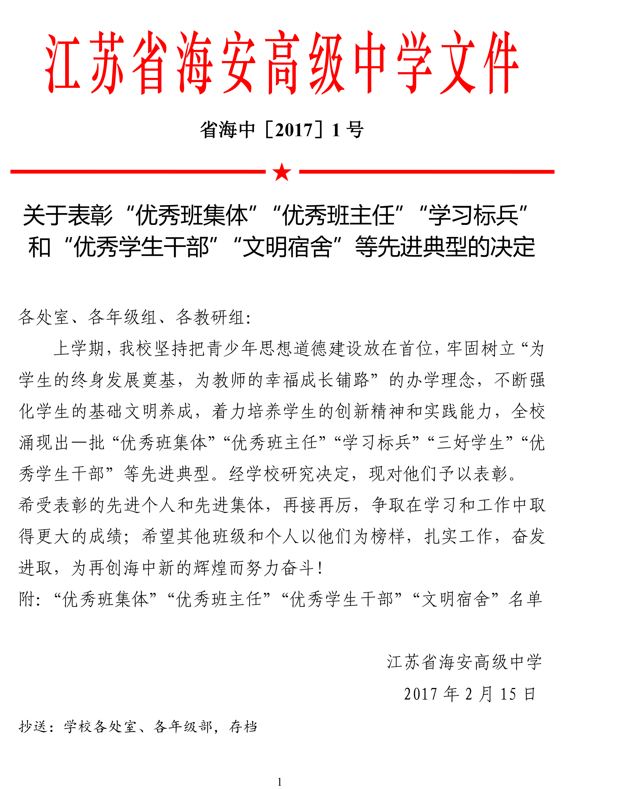 关于表彰“优秀班集体”“优秀班主任”“学习标兵”和“优秀学生干部”“文明宿舍”等先进典型的决定 来源: 发布时间:2017-02-15 00:00:00 浏览次数: 次 【字体:小 大】 分享到: 【打印正文】