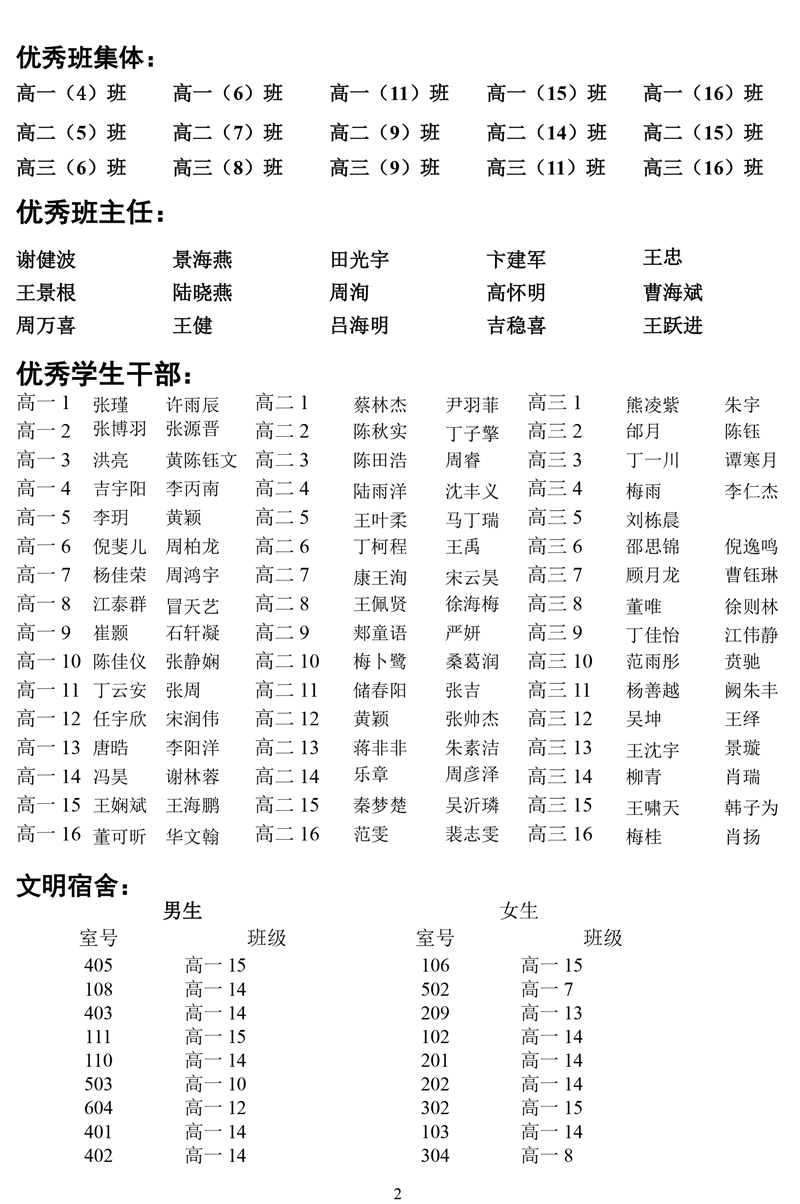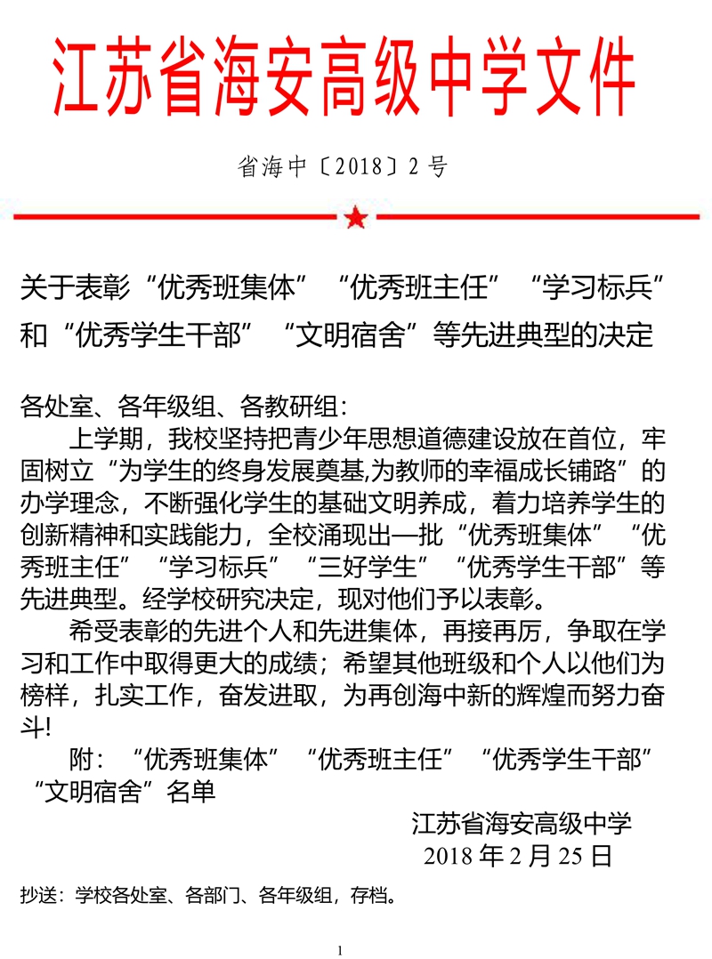 关于表彰“优秀班集体”“优秀班主任”“学习标兵”和“优秀学生干部”“文明宿舍”等先进典型的决定 来源: 发布时间:2018-02-25 00:00:00 浏览次数: 次 【字体:小 大】 分享到: 【打印正文】