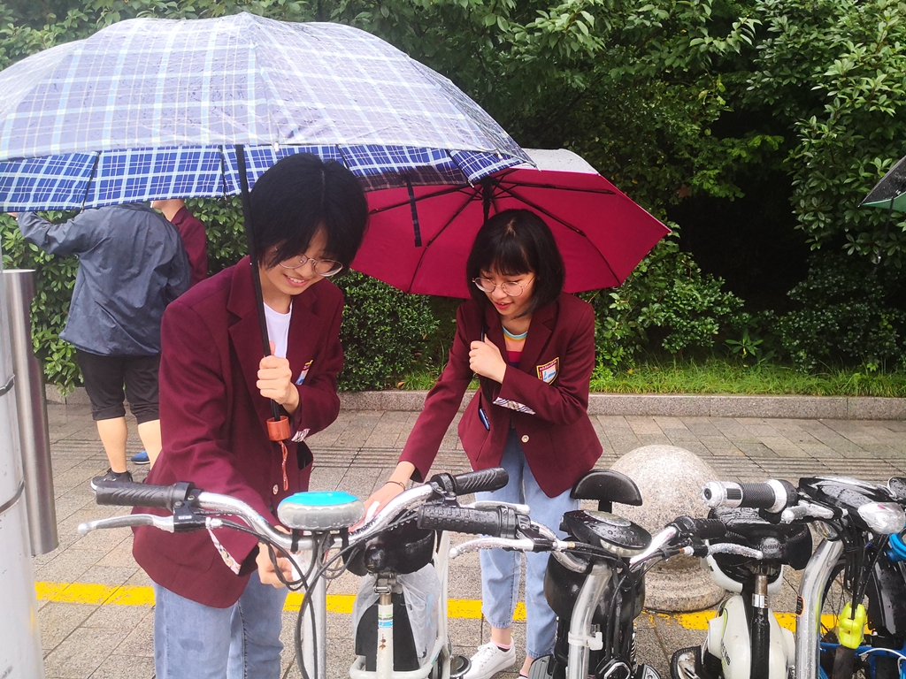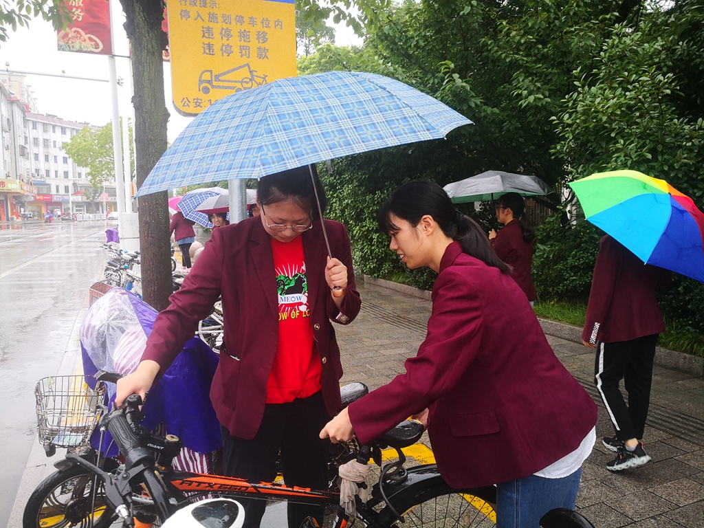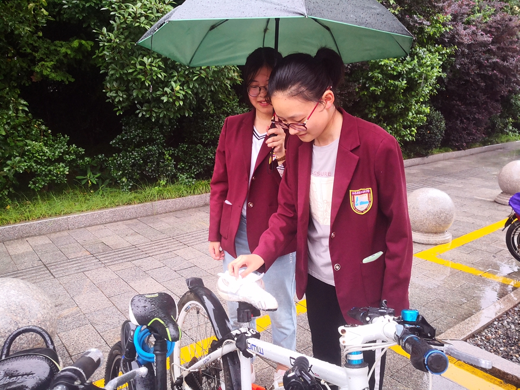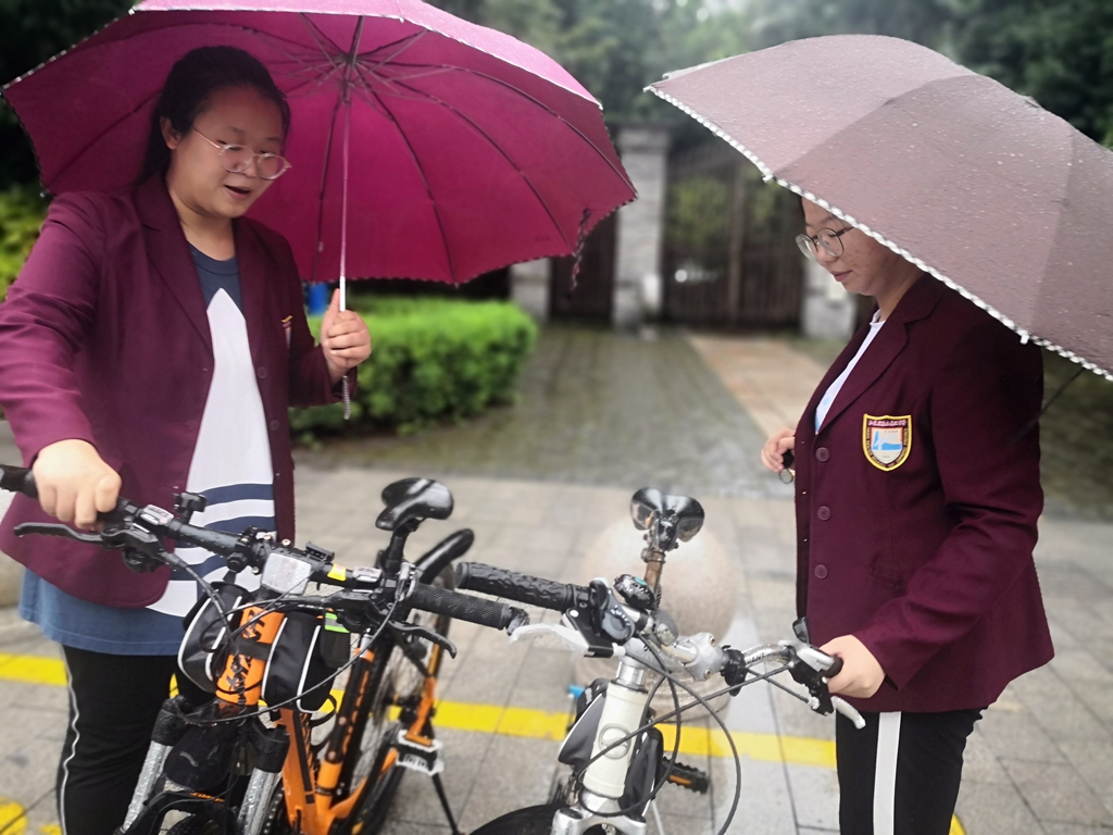 大家打着伞,两人一组,将学校大门外的自行车和教师办公楼后的自行车排放整齐。雨渐渐停止,大家就把车座、车把手擦干,让车主人用车时不至于弄湿衣服。
