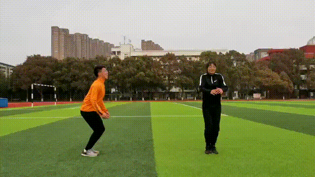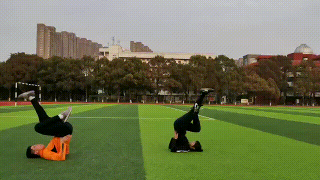 3.跳回地面的时候,先从脚尖落地,膝盖可以微弯,减少冲击力。双脚和双手回到原位。