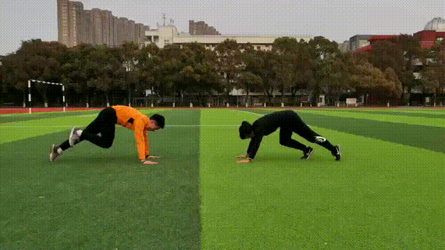 起始动作,如同俯卧撑一样,将全身重量置于手掌和脚趾上保持。保持身体为一直线。做俯卧跑步动作。开始时,交替的速度不求快,先要求动作平稳。待熟练后,再加快速度。