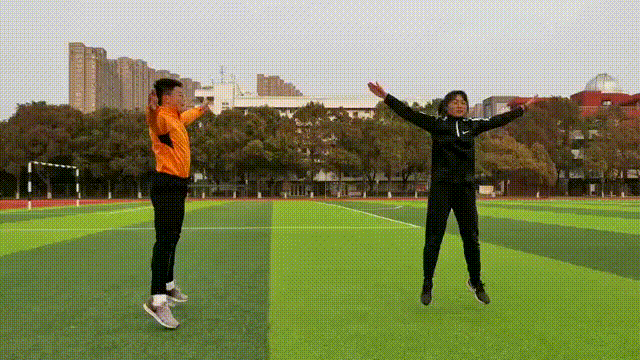 2.跳起的时候,双脚向外张开,双手高举过头到接近头顶正上方的位置。双手双脚都打直,膝盖不要弯曲。
