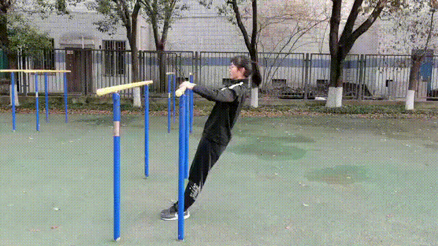 1.自然站立,两手分开与肩同宽,正握杠,两腿前伸,保持两臂与躯干呈90°,身体斜向下垂;做屈臂引体,当下颌触到或超过横杠时,伸臂复原,为完成一次。