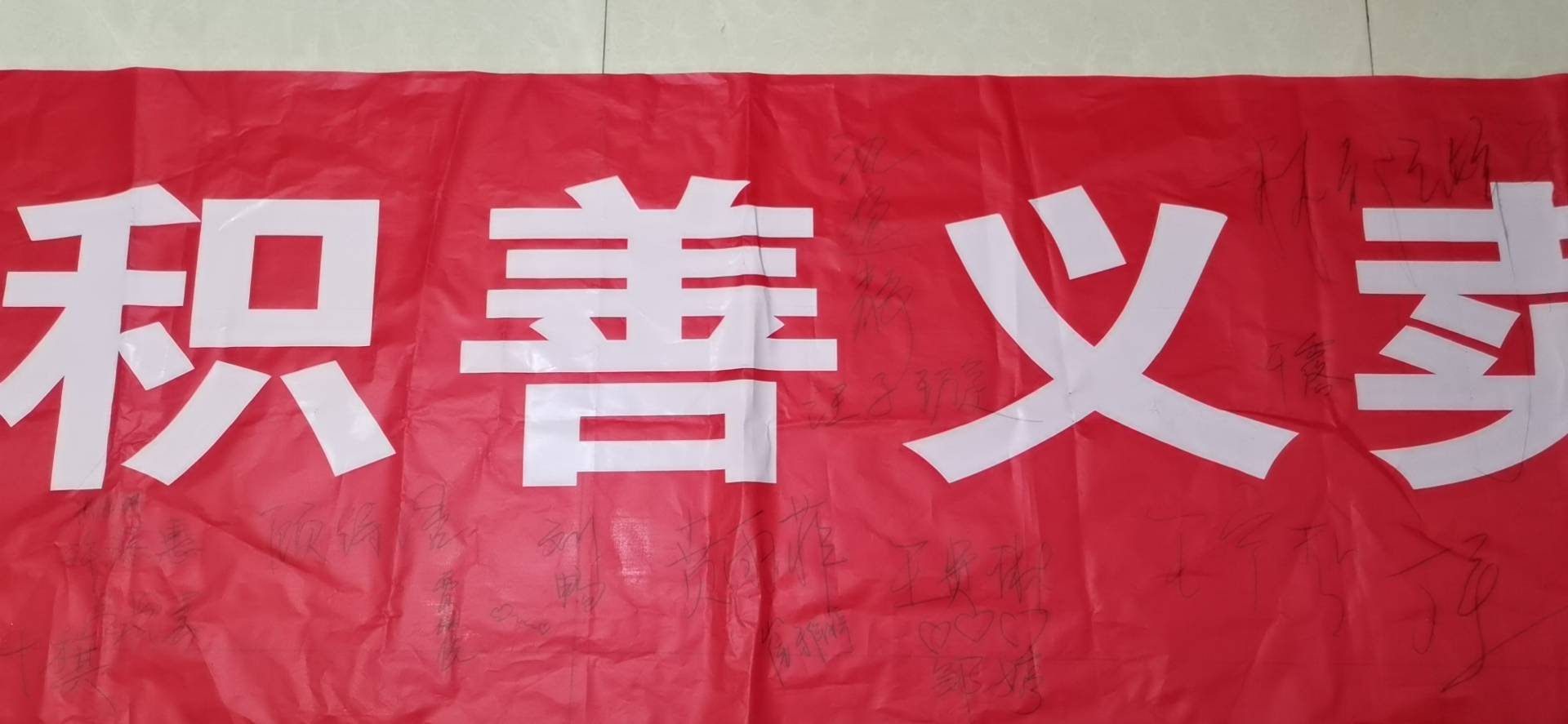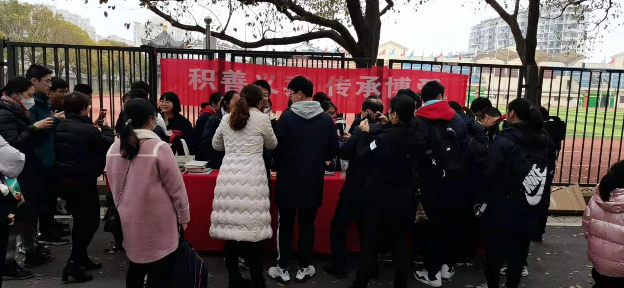 本次活动选址在学校成才大道。时间在中午放学集散高峰期。操场一隅的楼口栏杆上,我们将主题横幅挂上,红底白字,是我们赤诚的心与博爱。“积善义卖·传承博爱”,这八个大字浓缩了我们这个活动的宗旨和目标。横幅下是一排铺着红丝绒布的展台,展台上面罗列了许多同学们捐赠义卖的物品,如学习用品、日用品、图书、玩具、手工艺品、美术作品、旅游纪念品、小摆设等,现场还有我们的同学做才艺表演。