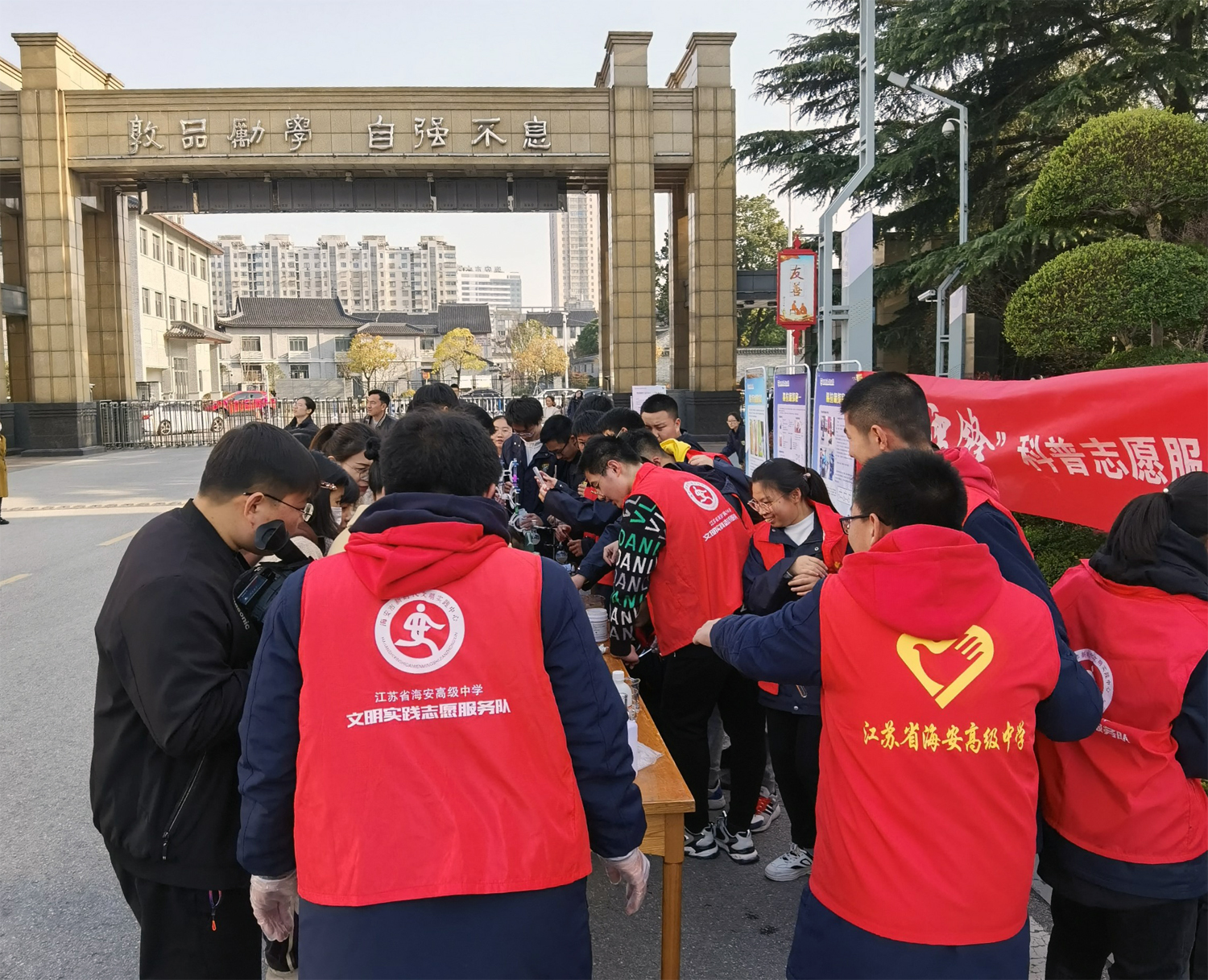 为了弘扬公益精神,宣传社会公德,倡导公益文化,践行“敦品励学 自强不息”的校训,培养“适应新时代,迎接接新挑战,肩负新使命,具备新品格”的新时代劳动者,海安中学海棠义工社、萌芽化学项目实验社、萌动生物社、阳光心理社、海中之声广播站等学生社团开展了“学雷锋”主题活动,号召学生学习雷锋,以青春建功为追求,用自己的光亮为身边的人带去一米阳光的温暖。