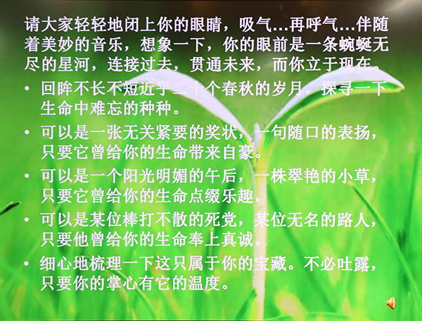 班会课从本班同学原创的一则小漫画开始,通过对漫画的解读和思考,引导大家发掘尊重生命的意义。接着,一出改编自真实事件的情景剧让同学们在放松的同时,开始重新评判我们对其它生命的态度。主持人对主演进行了采访,援引身边的例子,呼吁大家重拾对生命的尊重。本班同学原创的诗朗诵和全场参与的“飞花令”将班会气氛推向高潮,寓教于乐,在轻松愉快的活动中再次突出主题。最后,主持人带领同学们进行了一次遐想,回顾过往,带着对生命的敬重和热爱,迈向美好的未来。