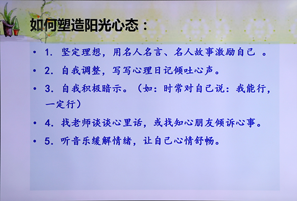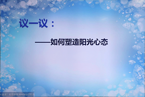 班会首先由田欣、吕灿同学的诗朗诵导入,引出班会主题——“拥有阳光心态,赢得快乐人生”。在观看了“九人过桥”视频后,大家激烈讨论,踊跃发言,争相表达对“阳光心态”一词的理解。